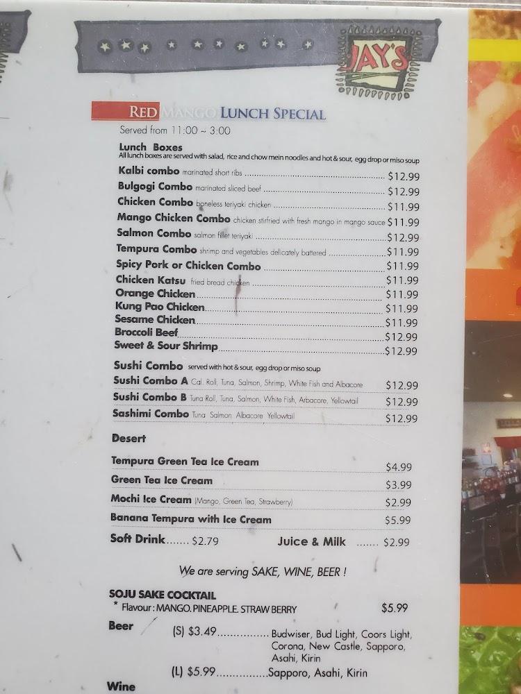 Welcome to Red Mango Grill, your ultimate destination for a delectable fusion of Japanese, Korean, Thai, and Chinese cuisines in Phelan, CA. Our inviting eatery offers a diverse menu with delicious dishes ranging from savory sushi to flavorful stir-fries, all expertly crafted to satisfy your cravings. Enjoy a quick lunch or leisurely dinner in a relaxed atmosphere, perfect for solo diners, families, or groups. With takeout and delivery services, you can savor our culinary delights anywhere. We also cater to vegetarians and health-conscious diners. Join us at 4037 Phelan Rd for an unforgettable dining experience!